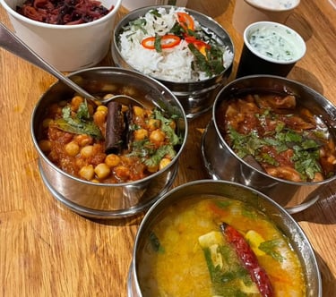 Tiffins often include: tomato and aubergine curry, black dhal, missouri rice, sambaro salad, and tasty bites such as dhokla or cauli bhajis. You can also choose optional extras which might include chapati, samosa, lassi and deserts.