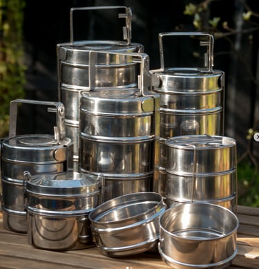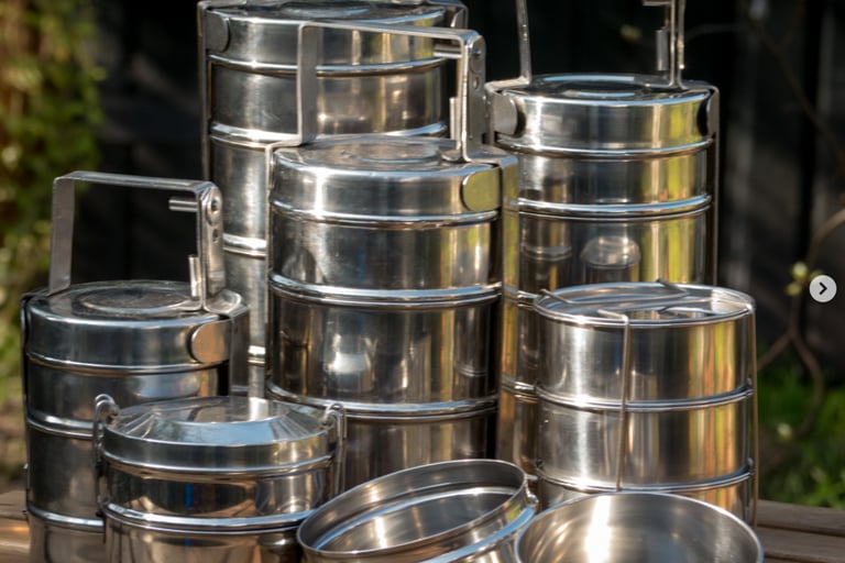 A traditional South Asian tiered Tiffin box containing a different meal each time.